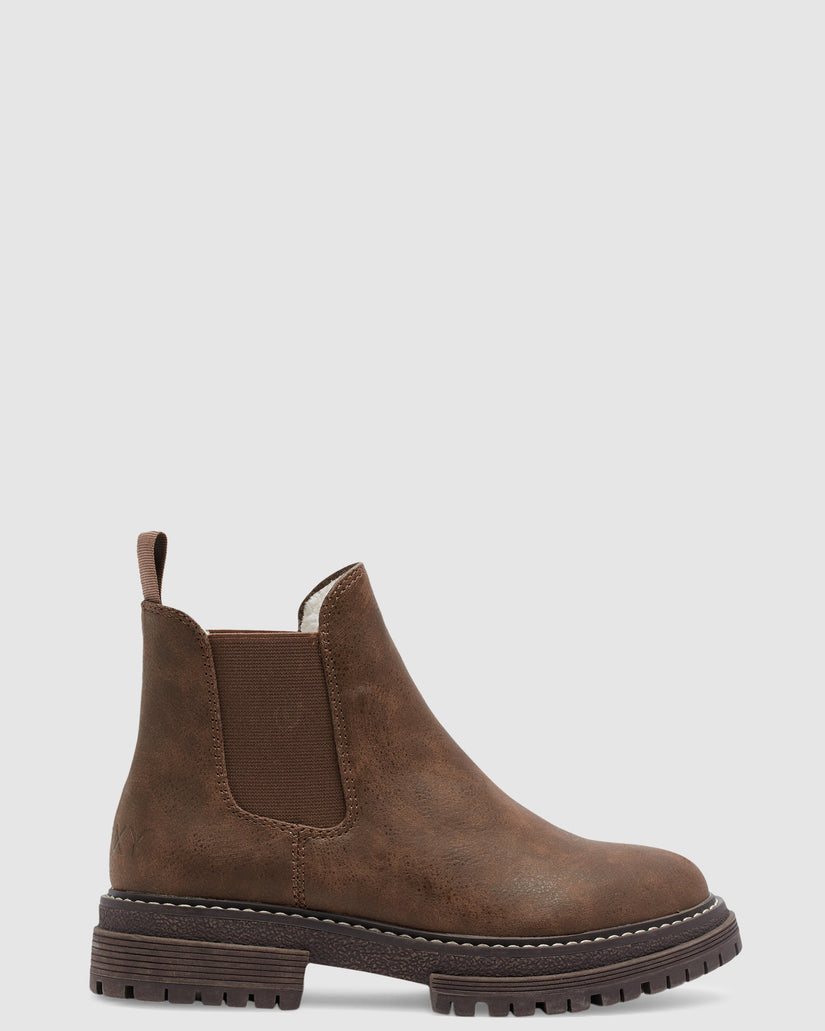 This slip-on Chelsea boot features a faux leather upper with plush sherpa lining to keep your feet warm and toasty during cold-weather adventures. Chunky lug sole completes the classic look.