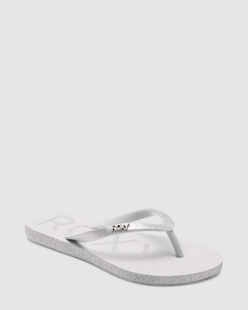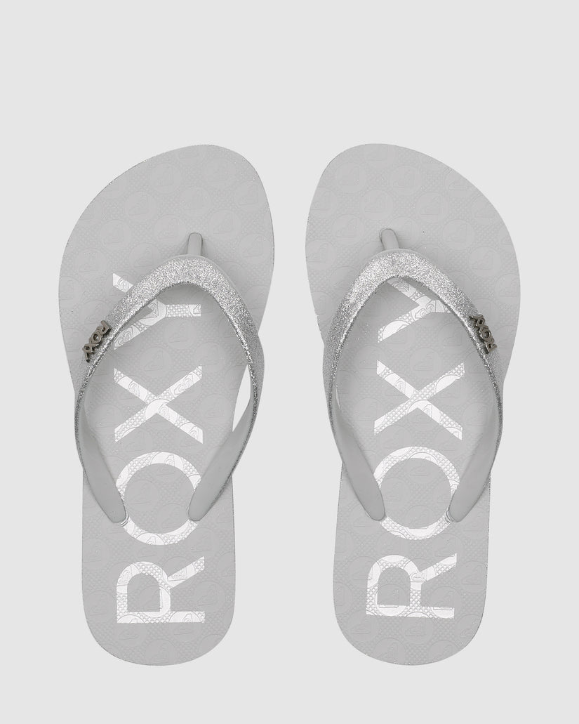 Sparkle in style with ROXY's Viva Glitter IV Flip Flops for girls, featuring a flexible rubber thong strap with glitter overlay and a recycled rubber footbed and outsole. Topped with a metal ROXY pin for a little something extra.