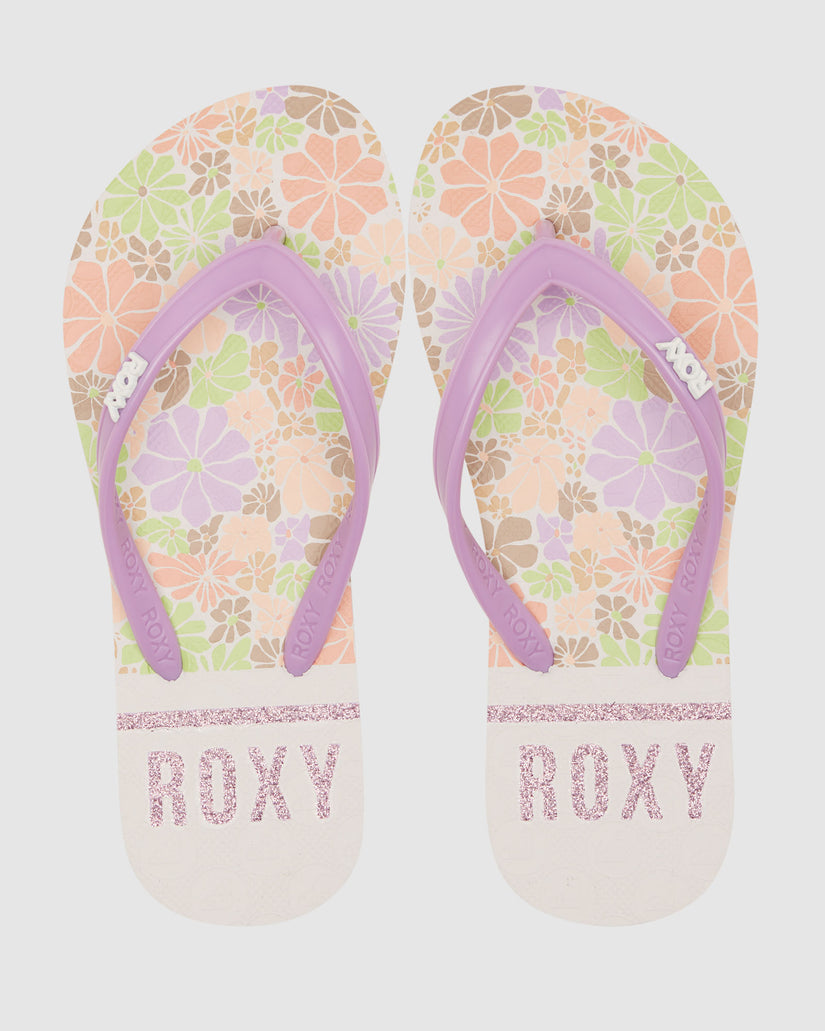 Lightweight and durable, these girls' flip-flop sandals are designed with a textured footbed and a flexible rubber outsole, adding a ROXY branded metal pin and signature print for a little something extra. Available in a range of colours to match any outfit.