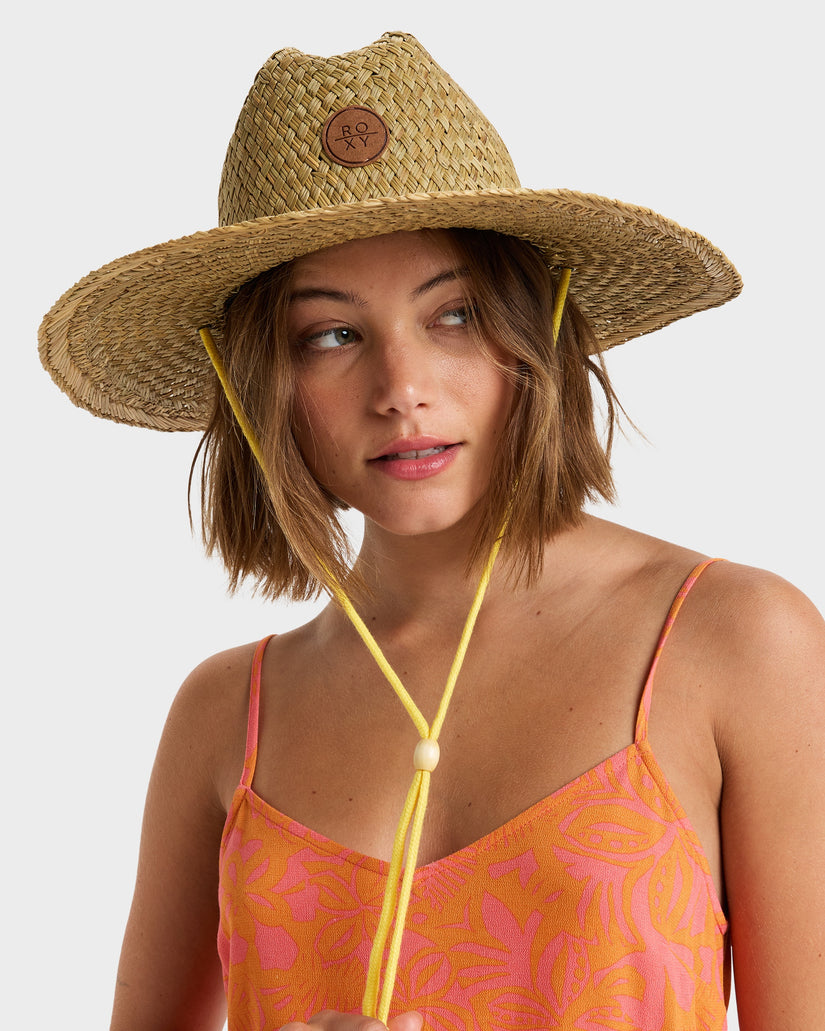 Shield yourself from rays in style with this straw fabric sun hat. The flat brim offers extra coverage, while the Roxy metal plate adds a touch of surf-chic. One size fits most.