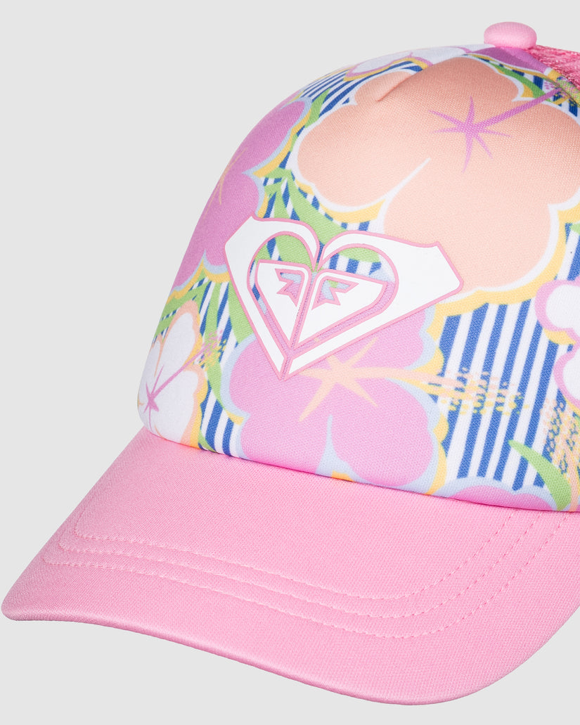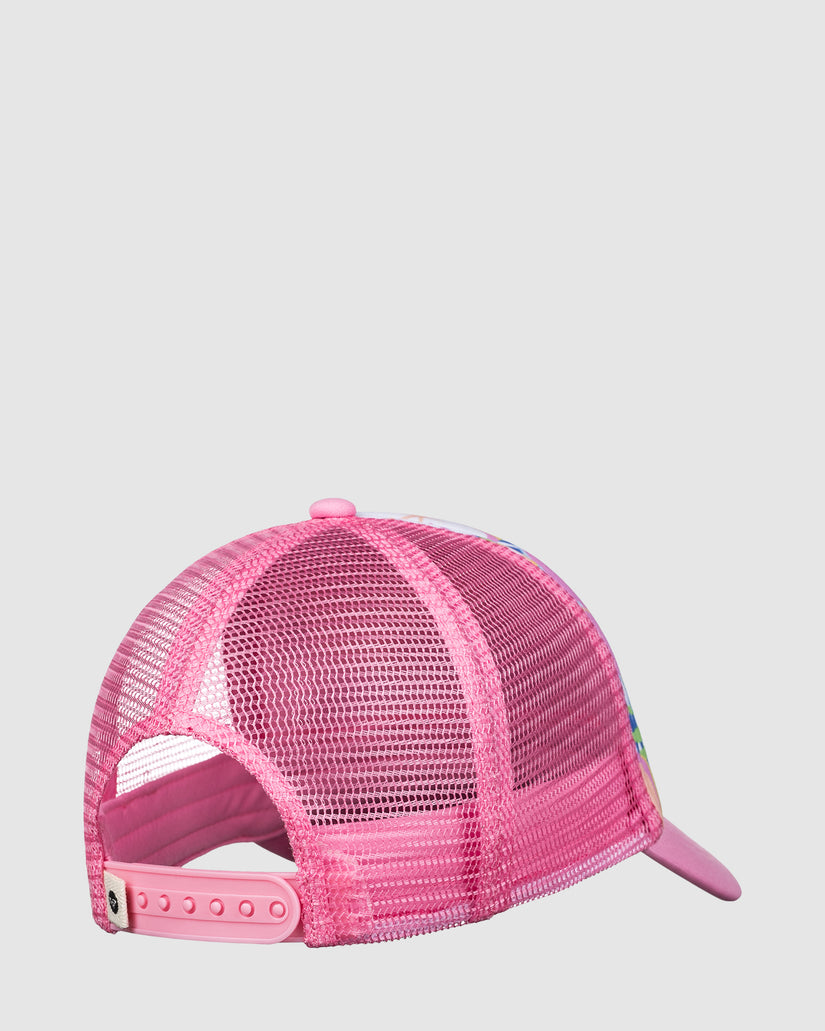 The ROXY Girl's Sweet Emotions toddler trucker hat is designed to keep your little one protected and happy in the sun with a lightweight, polyester fabric construction, curved visor, adjustable back closure, mesh back, and ROXY screen logo.
