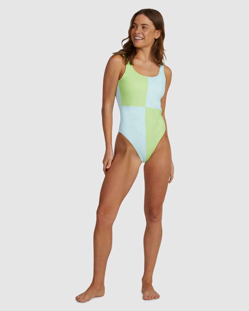 Made of ECONYL recycled swim fabric, this Stephanie Gilmore one-piece swimsuit has cut-and-sew chequered panels on the front, removable cups, and a low scoop back.